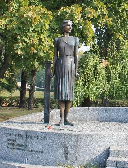 Tetiana Markus, a participant of the Soviet anti-Nazi resistance, was executed by the occupants in Babi Yar in 1942. Markus’ figure has an important symbolic meaning, personifying a Jewish woman as a fighter, not as a victim. In 2006 Markus was also awarded the title “Hero of Ukraine,” becoming the only woman to receive this high recognition for her contributions during World War II. Her monument in Babi Yar (sculptor Valerii Medvedev) depicts a young woman clenching her fists in demonstration of courage and hatred of the enemy. This way of heroic representation corresponds to the Soviet iconographic tradition of depicting Zoya Kosmodemianskaya, whose image has become a sort of general pattern for representation of a Soviet woman in the resistance.