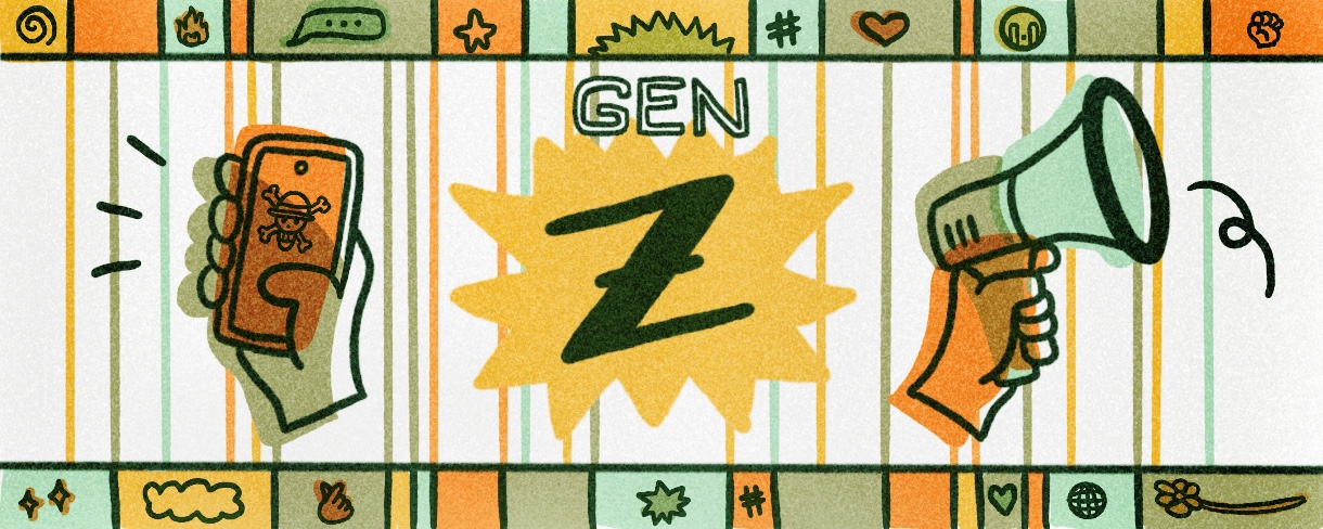 A colorful banner with the word 'Gen Z' in the center. On the left, a hand holds a smartphone with a pirate flag symbol (One Piece), on the right, a hand holds a megaphone. The background consists of vertical stripes, with decorative borders at the top and bottom featuring various icons such as a heart, fist, flame, and globe.